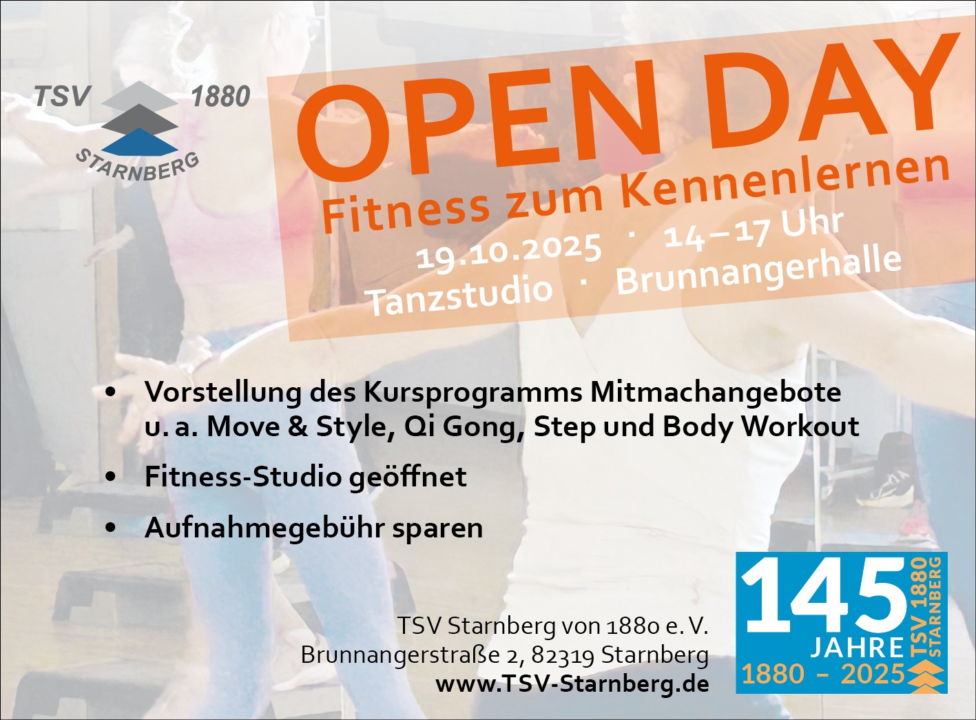 Wer das Fitness-Angebot des TSV Starnberg unverbindlich und kostenlos kennenlernen will, der ist am Sonntag, den 19.10.25 in der Brunnangerhalle genau richtig. Von 14 -17 Uhr lädt der TSV zu einem „Open Day“ im Tanzstudio des Vereins ein. Hier können sich Interessierte über das umfangreiches Fitness-Angebot des TSV informieren und einige Kurse gleich ausprobieren. Das vereinseigene Fitness-Studio hat ebenfalls geöffnet.