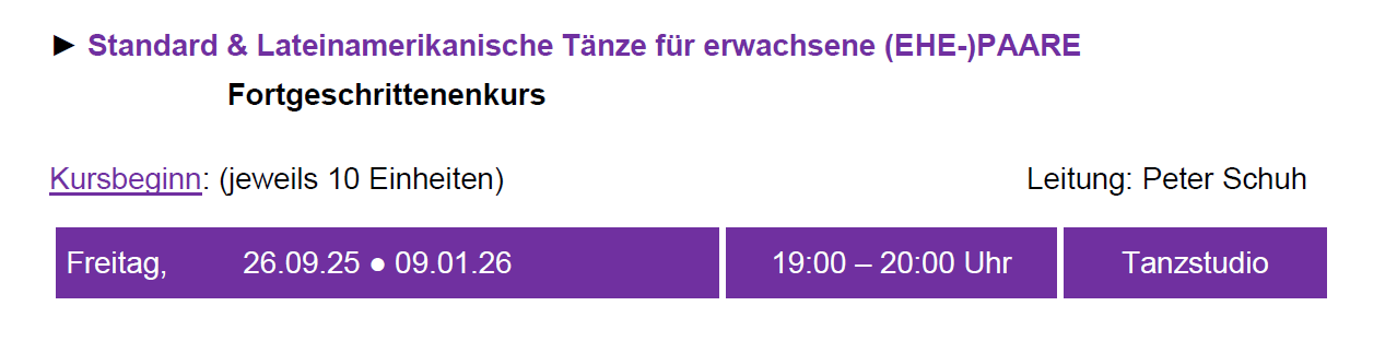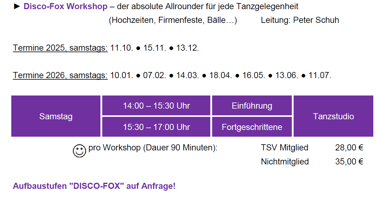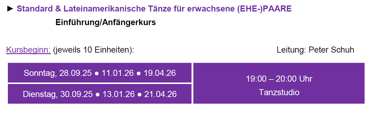 Alle weiteren Informationen zu Terminen, Preisen und Anmeldung von Kursen, die unter der Leitung von Peter Schuh stehen, erhalten Sie direkt beim "TANZ-SCHUH" telefonisch unter 0172-865 18 43 und auf www.tanzschule-starnberg.de